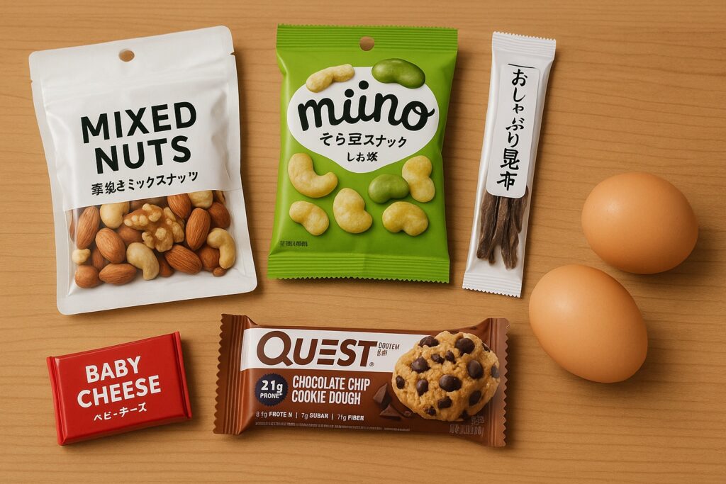 - 小分け系: 個包装ナッツ(1袋20g)、チーズ1個、プロテインバー(ハーフサイズ)