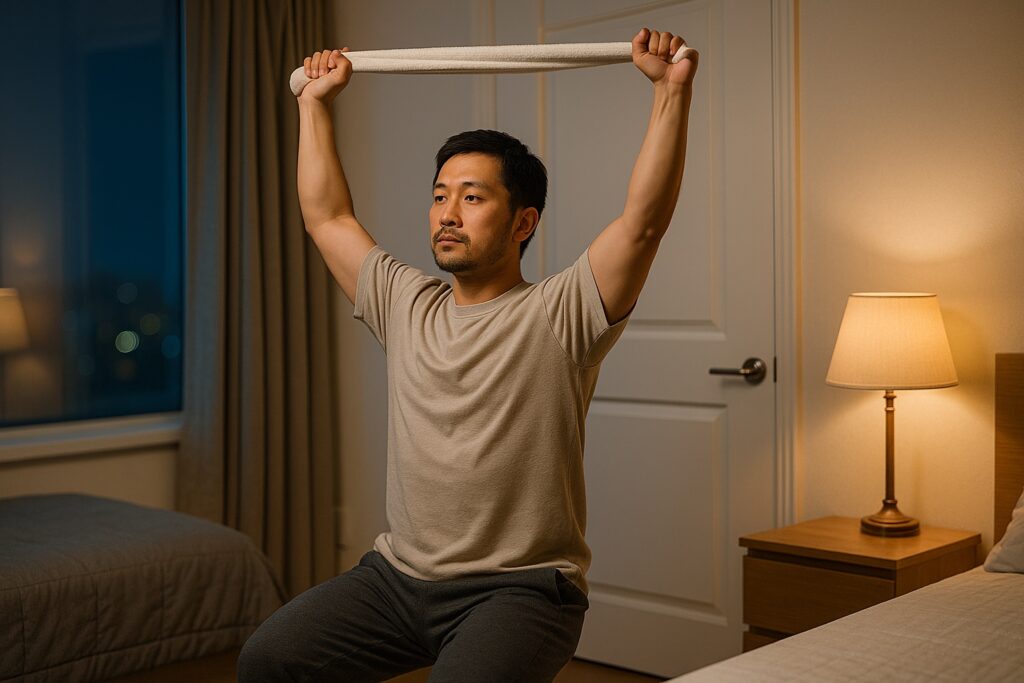終了後に、横隔膜呼吸(仰向けで片手を胸、片手をお腹に置き、お腹をふくらませて4秒吸って6秒吐く)を2分、さらに背中と胸のストレッチ、股関節の90/90座りを各30秒ずつ。シャワーはぬるめで5分、就寝30〜60分前に実施すると、体温の自然降下が寝付きを助けます。カフェインは夕方以降避け、運動後は水かノンカフェインのお茶を少量。これで“穏やかな満足感”と“眠気の波”の両立が可能です。